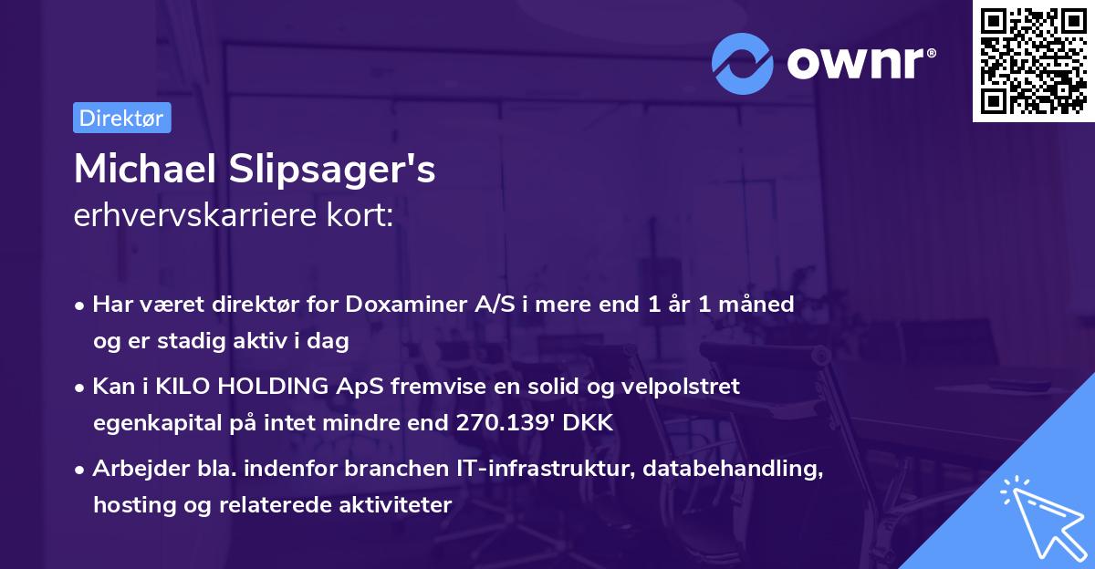 Det begyndte den dag i 1995 ved KILOWARE ApS (tidligere PBH NR. 22.763 ApS) i hvervet som Direktør og Bestyrelsesmedlem. Rollen som Direktør havde Michael Slipsager i 5 år 4 måneder, før fratrædelsen den 24. maj 2000.