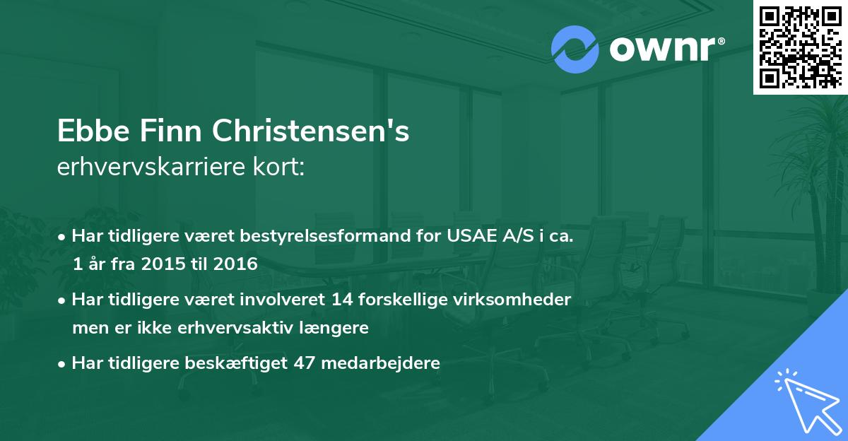 Der er umiddelbart ikke meget erhvervsaktivitet forbundet med Ebbe Finn Christensen. Den første gang Ebbe var registreret som erhvervsdrivende ifølge Erhvervs & Selskabsstyrelsen var tilbage i 1986 i ADMINISTRATIONSSELSKABET AF 30.03.1995 A/S (tidligere ASX 9877 ApS) i rollen som Direktør. Hvervet som Direktør bestred Ebbe Finn Christensen i 6 år 9 måneder, før fratrædelsen d. 19. januar 1993.