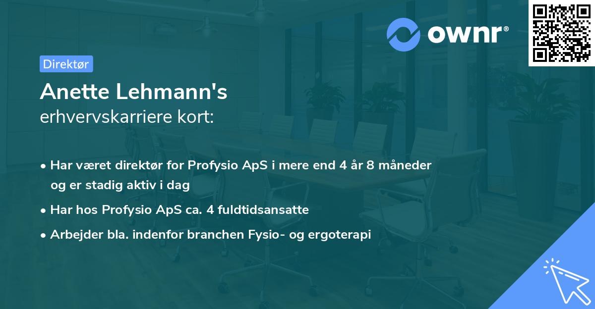 Anette har sidenhen været inde omkring én anden dansk virksomhed. Karrieren har indtil nu varet i mere end 12 år 4 måneder.