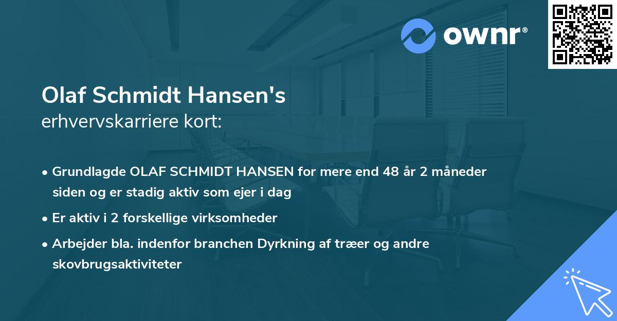 Olaf har været engageret i flere virksomheder og må betegnes som en yderst handlekraftig iværksætter. Har indtil videre haft en erhvervskarriere på mere end 48 år 2 måneder.