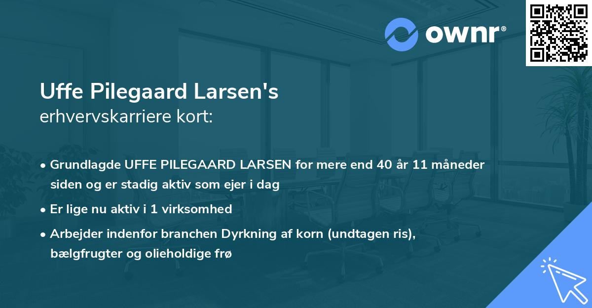 Karrieren i erhvervslivet startede i 1985 ved UFFE PILEGAARD LARSEN i rollen som Stifter og Ejer. Virksomheden blev alene grundlagt af Uffe Pilegaard Larsen og har som eneejer derfor også hovedansvaret i firmaet. Rollen som Stifter og Ejer har Uffe nu bestreddet i 40 år 11 måneder, og er stadig aktiv i samme rolle i dag.