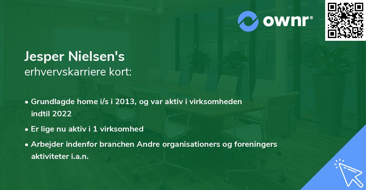 Karrieren i erhvervslivet begyndte for alvor dengang i 2013 i home i/s som Ejer og Stifter. Det var sammen med partneren Henrik Pedersen at Jesper Nielsen stiftede home i/s den dag i november 2013. Hvervet som Ejer og Stifter havde Jesper i 9 år, inden stoppet d. 29. november 2022.