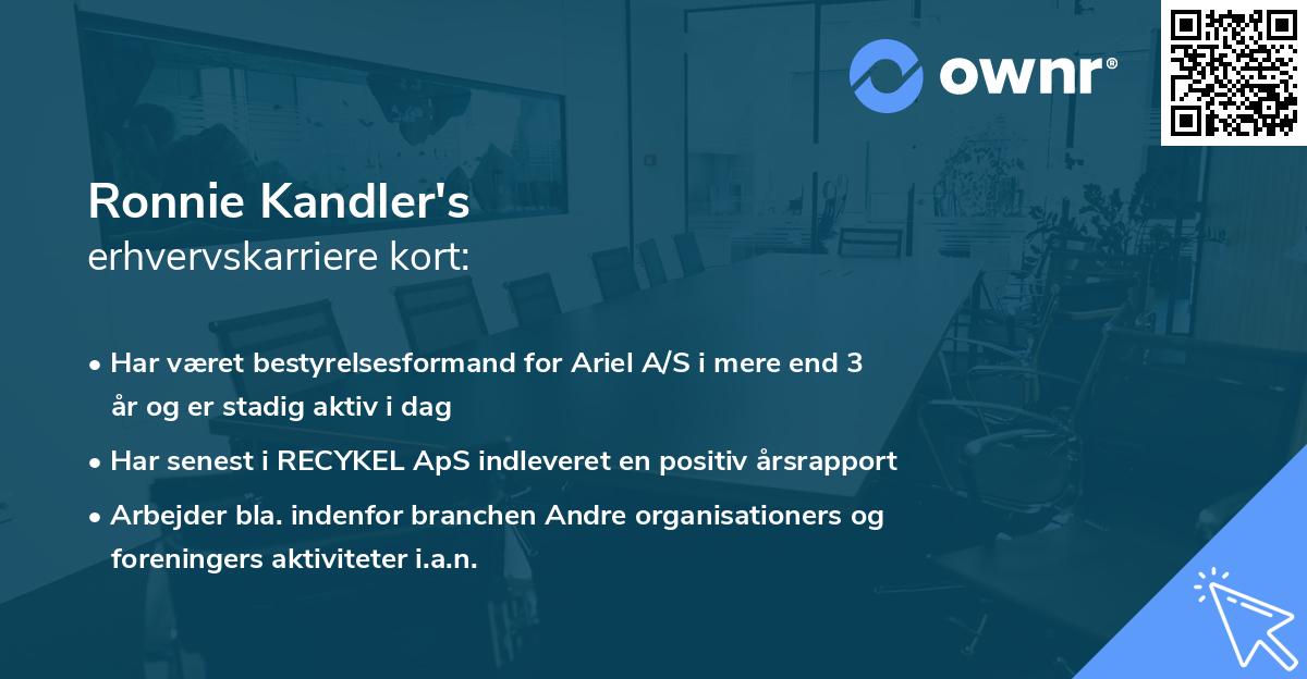 Karrieren i erhvervslivet startede i 2006 hos KANDLER INVEST ApS i rollen som Direktør. Titlen som Direktør bestred Ronnie Kandler i 6 år 2 måneder, før stoppet d. 21. januar 2013.