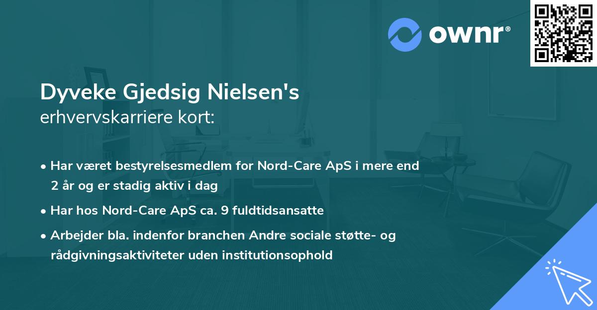 Karrieren som erhvervsaktiv begyndte for alvor dengang i 2015 hos Dyveke Yoga & Pilates som Stifter og Ejer. Virksomheden blev stiftet af Dyveke Gjedsig Nielsen og har som eneste ejer fået hele ansvaret og fuld stemmeret i virksomheden. Titlen som Stifter og Ejer har Dyveke nu besiddet i 11 år 1 måned, og er stadig aktiv i Selvsamme rolle i dag.