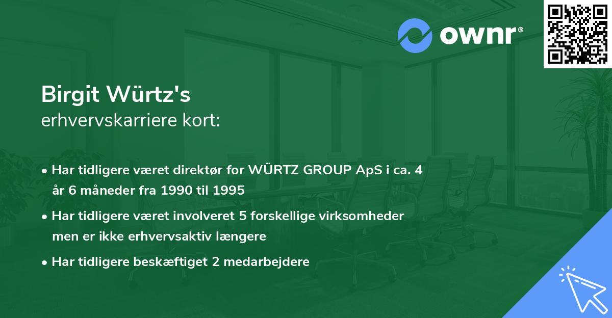 Der er umiddelbart ikke meget erhvervsaktivitet forbundet med Birgit Würtz. Den første gang Birgit var registreret som erhvervsdrivende ifølge Erhvervs og Selskabsstyrelsen var tilbage i 1990 hos WÜRTZ GROUP ApS (tidligere ApS KBIL 15 NR. 1210) med titlen som Direktør og Bestyrelsesmedlem. Titlen som Direktør bestred Birgit Würtz i 4 år 6 måneder, før stoppet d. 23. marts 1995.