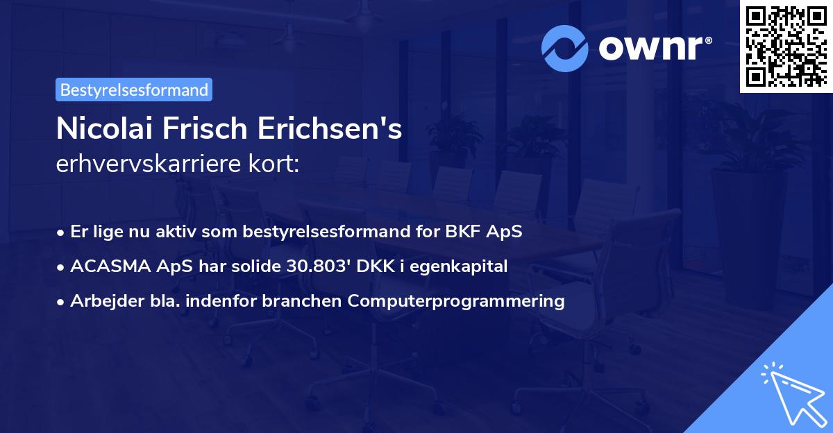 Karrieren som erhvervsaktiv i Danmark begyndte for alvor dengang i 2004 hos ACASMA ApS som Stifter, Ejer og Direktør. Virksomheden blev kun stiftet af Nicolai Frisch Erichsen og har som eneste ejer fået hele ansvaret og fuld stemmeret i virksomheden. Titlen som Stifter, Ejer og Direktør har Nicolai nu besiddet i 22 år, og er stadig aktiv i Selvsamme rolle i dag.