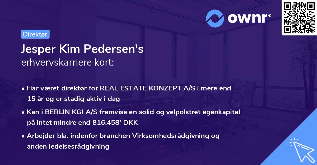 Det startede i 2008 hos KG KONZEPT ApS (tidligere KG KONZEPT A/S) i rollen som Direktør. Titlen som Direktør bestred Jesper Kim Pedersen i 10 år 10 måneder, før stoppet d. 19. november 2018.