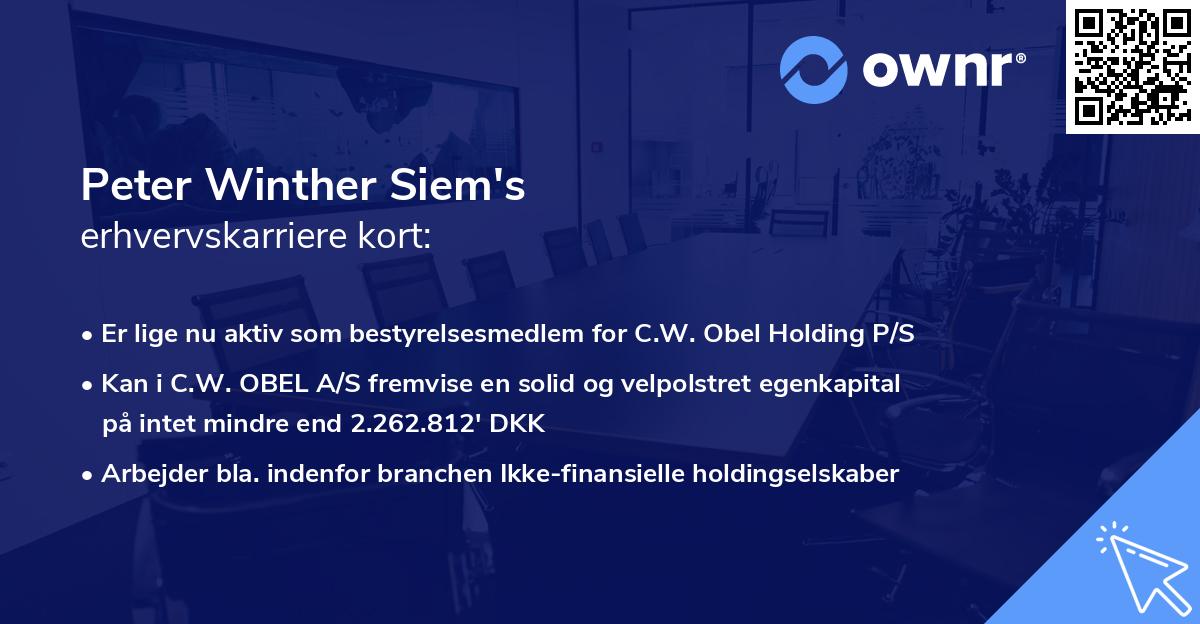 Karrieren som erhvervsaktiv startede for alvor en dag i 2014 ved C.W. OBEL A/S med titlen som Bestyrelsesmedlem. Rollen som Bestyrelsesmedlem bestred Peter Winther Siem i 3 år 11 måneder, før stoppet den 22. april 2018.