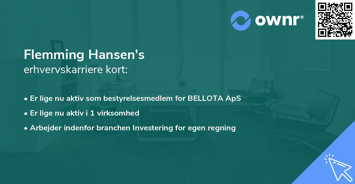 Karrieren i erhvervslivet begyndte for alvor dengang i 2012 ved BELLOTA ApS som Ejer og Bestyrelsesmedlem. Flemming Hansen købte en andel af virksomheden den 26. november 2012 og havde en andel på 10-14.99%. På det tidspunkt bestod partnerkredsen udover Flemming af: Ingrid Hoegh Kofoed, Henrik Retsloff Pedersen, Per Neumann og 6 andre personer. Rollen som Ejer og Bestyrelsesmedlem har Flemming nu besiddet i 13 år 3 måneder, og er stadig aktiv i samme rolle i dag.