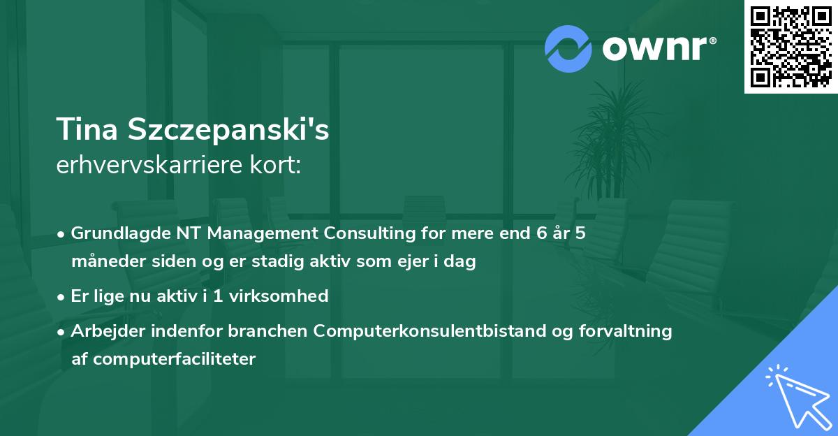 Erhvervskarrieren begyndte for alvor dengang i 2016 ved NT Management Consulting IvS som Stifter, Ejer og Direktør. Denne rolle havde Tina Szczepanski i 3 år, før fratrædelsen den 23. oktober 2019.