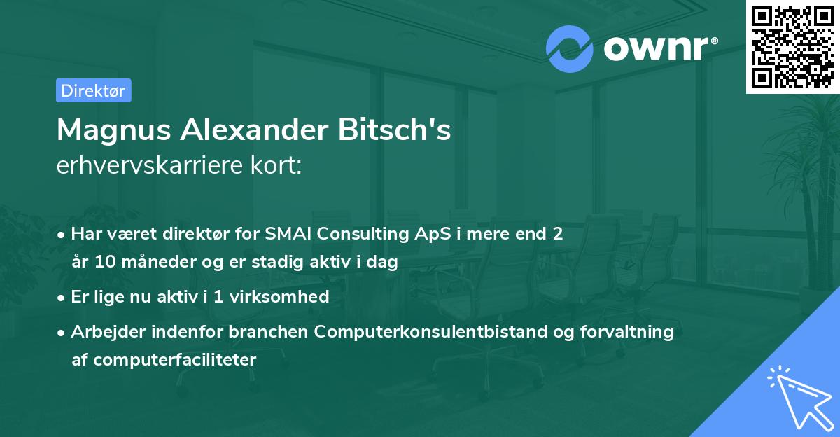 Magnus har sidenhen været inde omkring én anden dansk virksomhed. Har indtil videre haft en erhvervskarriere på mere end 5 år 6 måneder.