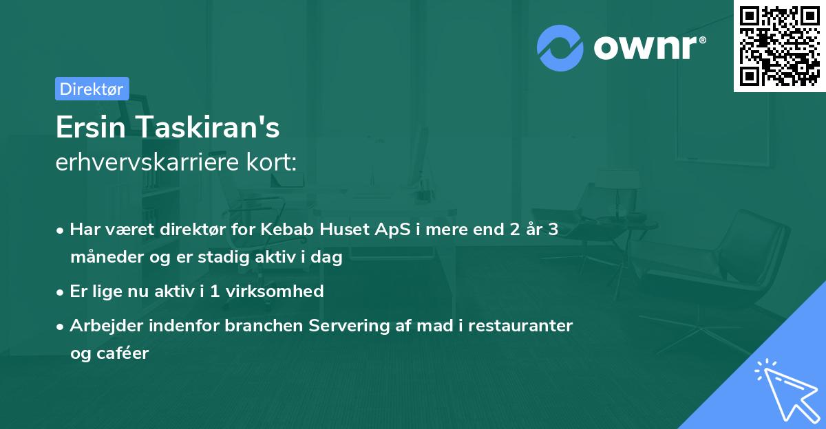 Karrieren som erhvervsaktiv i Danmark begyndte den dag i 2017 hos SKÆLSKØR STEAKHOUSE ApS i hvervet som Direktør. Titlen som Direktør havde Ersin Taskiran i 5 måneder, inden stoppet den 7. december 2017.