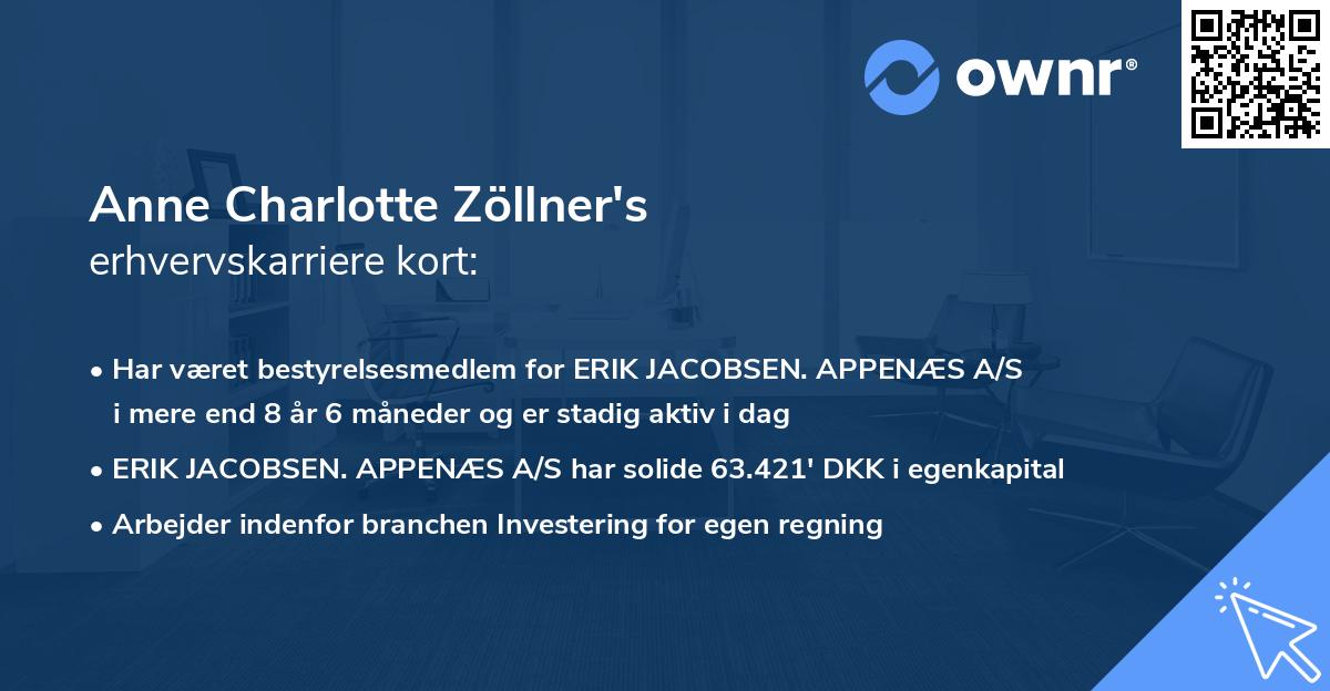 Det hele begyndte for alvor dengang i 2017 i ERIK JACOBSEN. APPENÆS A/S som Bestyrelsesmedlem og Ejer. Hvervet som Bestyrelsesmedlem har Anne Charlotte Zöllner nu besiddet i 8 år 6 måneder, og er stadig aktiv i den samme rolle i dag.