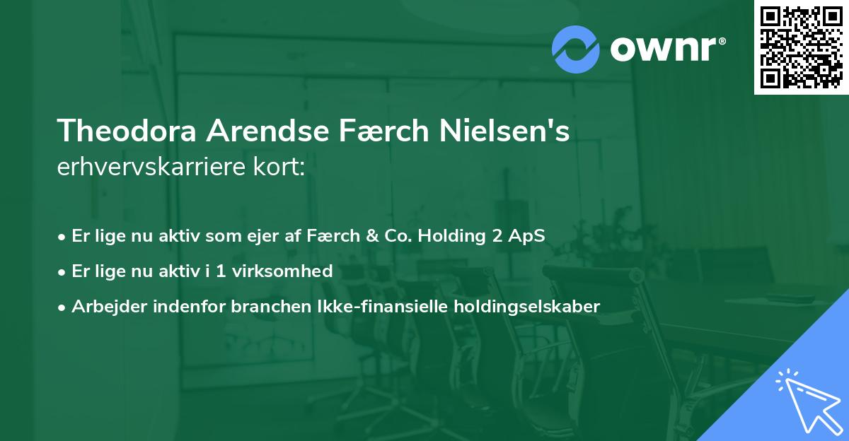 Karrieren som erhvervsperson begyndte den dag i 2019 i Færch & Co. Holding 1 ApS i hvervet som Ejer. Theodora Arendse Færch Nielsen købte sig ind i virksomheden den 4. juni 2019 og havde en ejerandel på 10-14.99%. På det tidspunkt bestod ejerkredsen udover Theodora af: Lone Færch, Bjarke Hedelund Færch, Aslaug Elizabeth Færch Johnsen og 6 andre personer. Hvervet som Ejer havde Theodora i 6 år, inden stoppet d. 25. juni 2025.