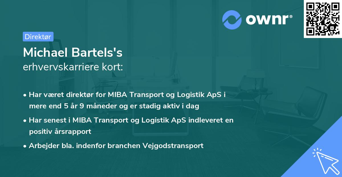 Karrieren som erhvervsaktiv begyndte den dag i 2020 ved MIBA Transport og Logistik Holding ApS i hvervet som Stifter, Direktør og Ejer. Virksomheden blev stiftet af Michael Bartels og har som eneste ejer dermed også fået det fulde ansvar i virksomheden. Rollen som Stifter, Direktør og Ejer har Michael nu besiddet i 5 år 9 måneder, og er stadig aktiv i samme rolle i dag.