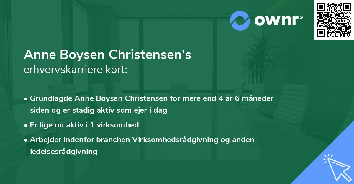 Karrieren som erhvervsaktiv i Danmark begyndte den dag i 2021 ved Anne Boysen Christensen i hvervet som Ejer og Stifter. Virksomheden blev grundlagt af Anne Boysen Christensen og har som eneste ejer dermed også fået det fulde ansvar i virksomheden. Rollen som Ejer og Stifter har Anne nu besiddet i 4 år 6 måneder, og er stadig aktiv i samme rolle i dag.