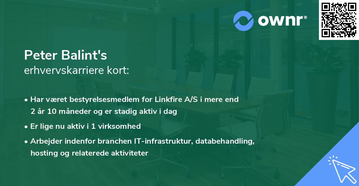 Karrieren i erhvervslivet begyndte den dag i 2023 i Linkfire A/S i hvervet som Bestyrelsesmedlem. Hvervet som Bestyrelsesmedlem har Peter Balint nu besiddet i 2 år 10 måneder, og er stadig aktiv i den samme rolle i dag.
