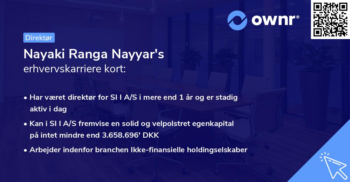 Karrieren i erhvervslivet begyndte den dag i 2025 ved SI I A/S i hvervet som Direktør. Rollen som Direktør har Nayaki Ranga Nayyar nu besiddet i 1 år, og er stadig aktiv i samme rolle i dag.