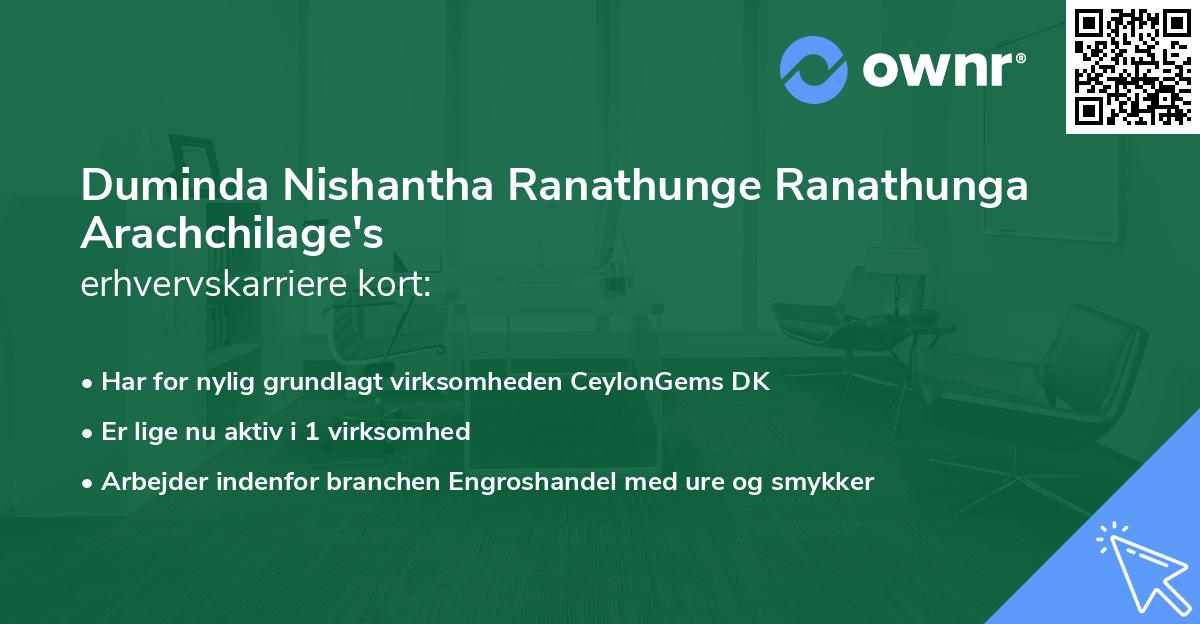 Karrieren som erhvervsaktiv i Danmark begyndte den dag i 2025 hos CeylonGems DK i hvervet som Stifter og Ejer. Virksomheden blev stiftet af Duminda Nishantha Ranathunge Ranathunga Arachchilage og har som eneste ejer dermed også fået det fulde ansvar i virksomheden. Titlen som Stifter og Ejer har Duminda nu besiddet i 11 måneder, og er stadig aktiv i Selvsamme rolle i dag.