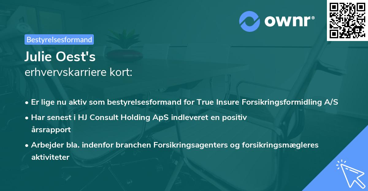 Karrieren i erhvervslivet startede for alvor en dag i 2024 hos HJ Consult Holding ApS med titlen som Ejer. Denne rolle har Julie Oest nu bestreddet i 1 år 5 måneder, og er stadig aktiv i Selvsamme rolle i dag.
